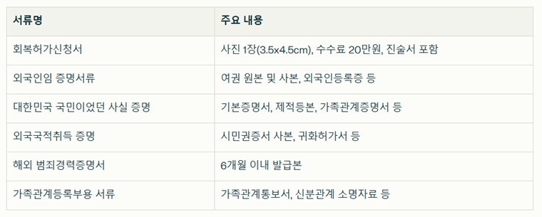 -국적회복 허가 후 외국국적 이탈 또는 불행사 서약 절차가 요구됩니다.
