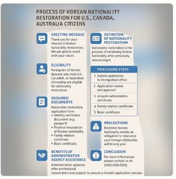 이 글에서는 대한민국 국적을 회복하고자 하는 미국, 캐나다, 호주 시민권자분들을 위해, 꼭 알아두셔야 할 절차와 준비서류, 그리고 실수 없이 진행할 수 있는 방법까지 친절하게 안내드리고자 합니다.