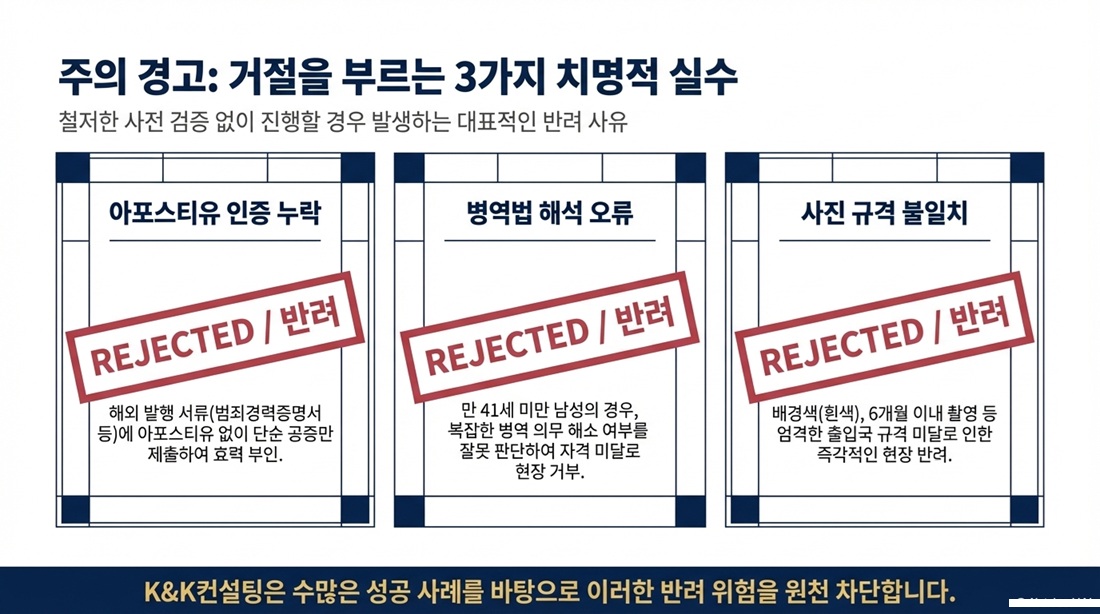 ● 병역법 해석 오류: 만 41세 미만 남성의 경우 병역 의무 해소 여부를 잘못 판단하여 신청이 거부되는 사례가 빈번합니다.